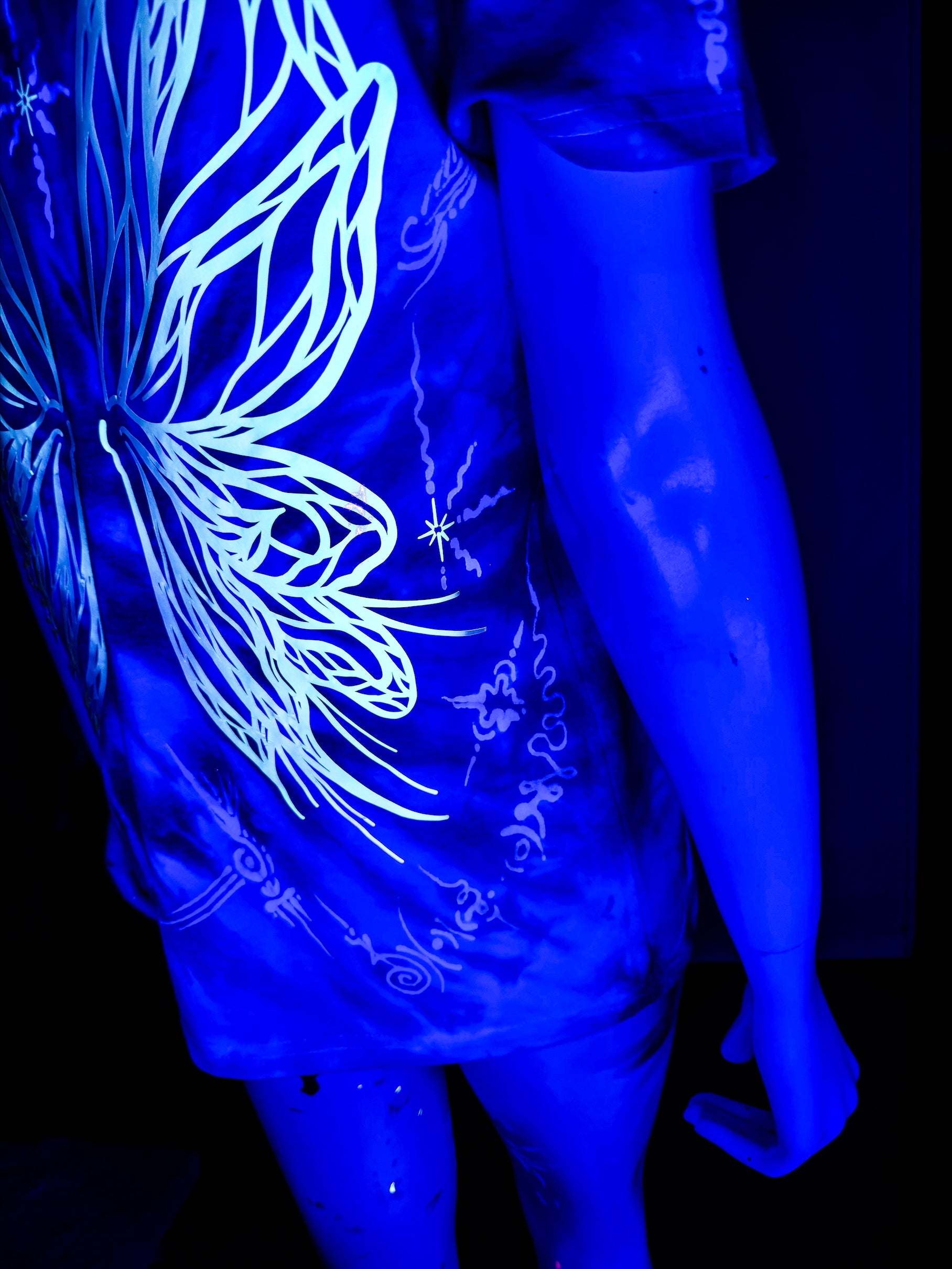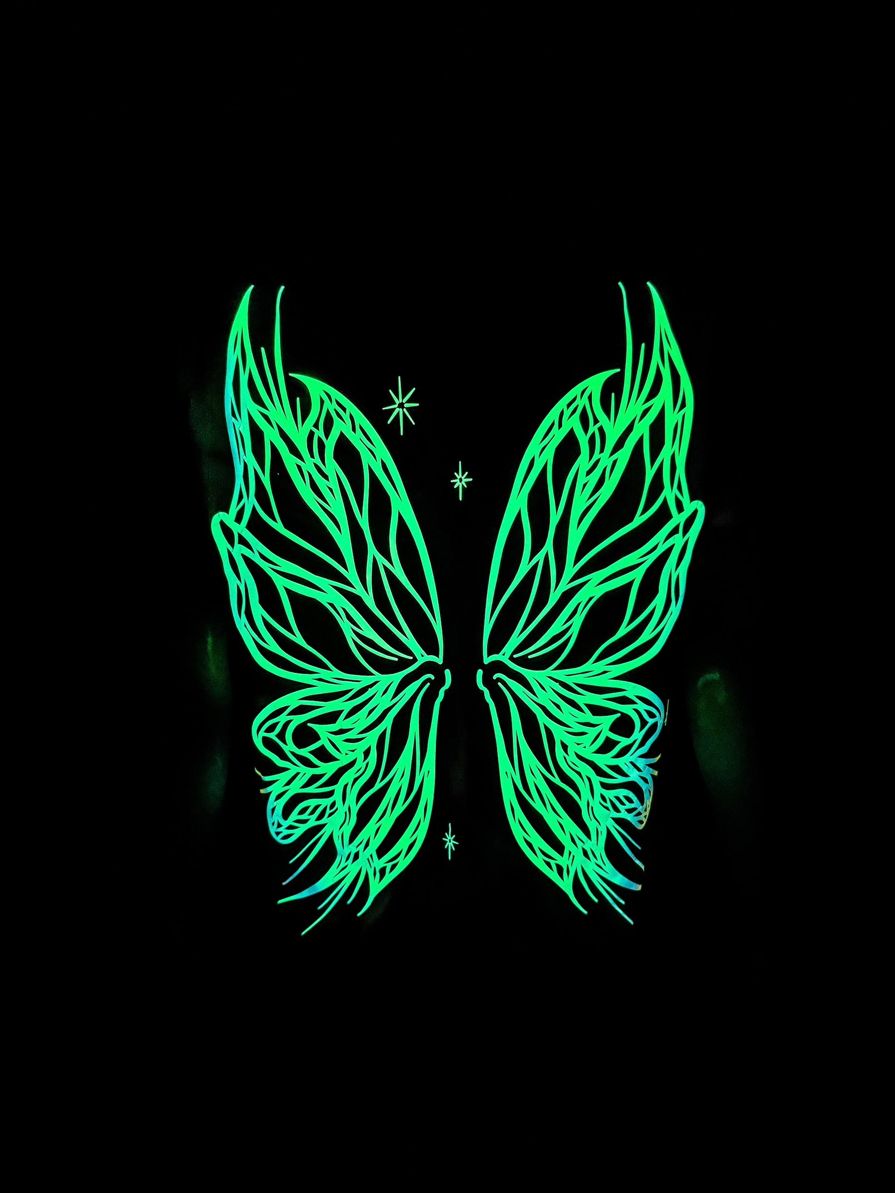 The painted designs on these shirts illuminate under black light, as do the glow wings on the back,