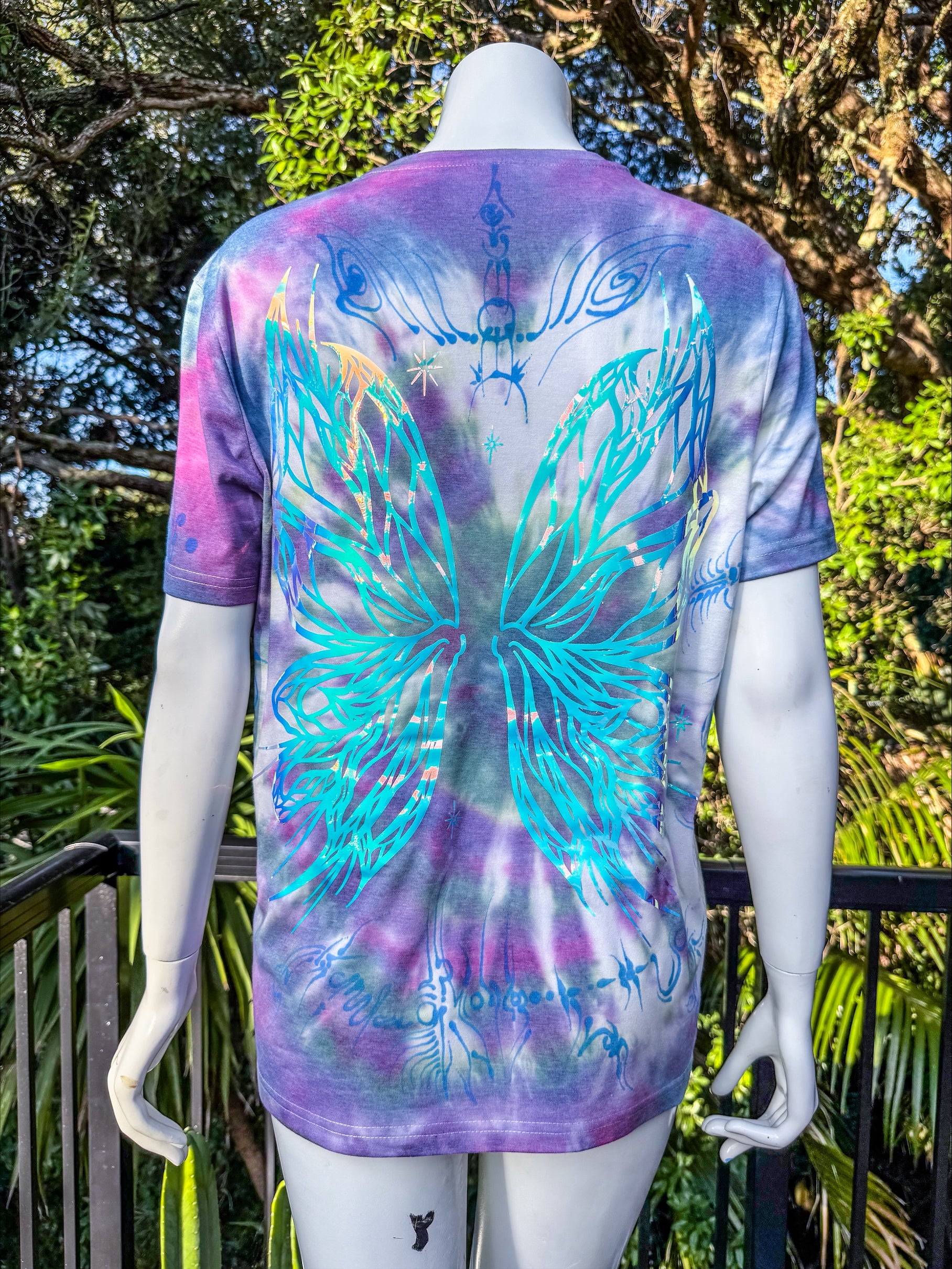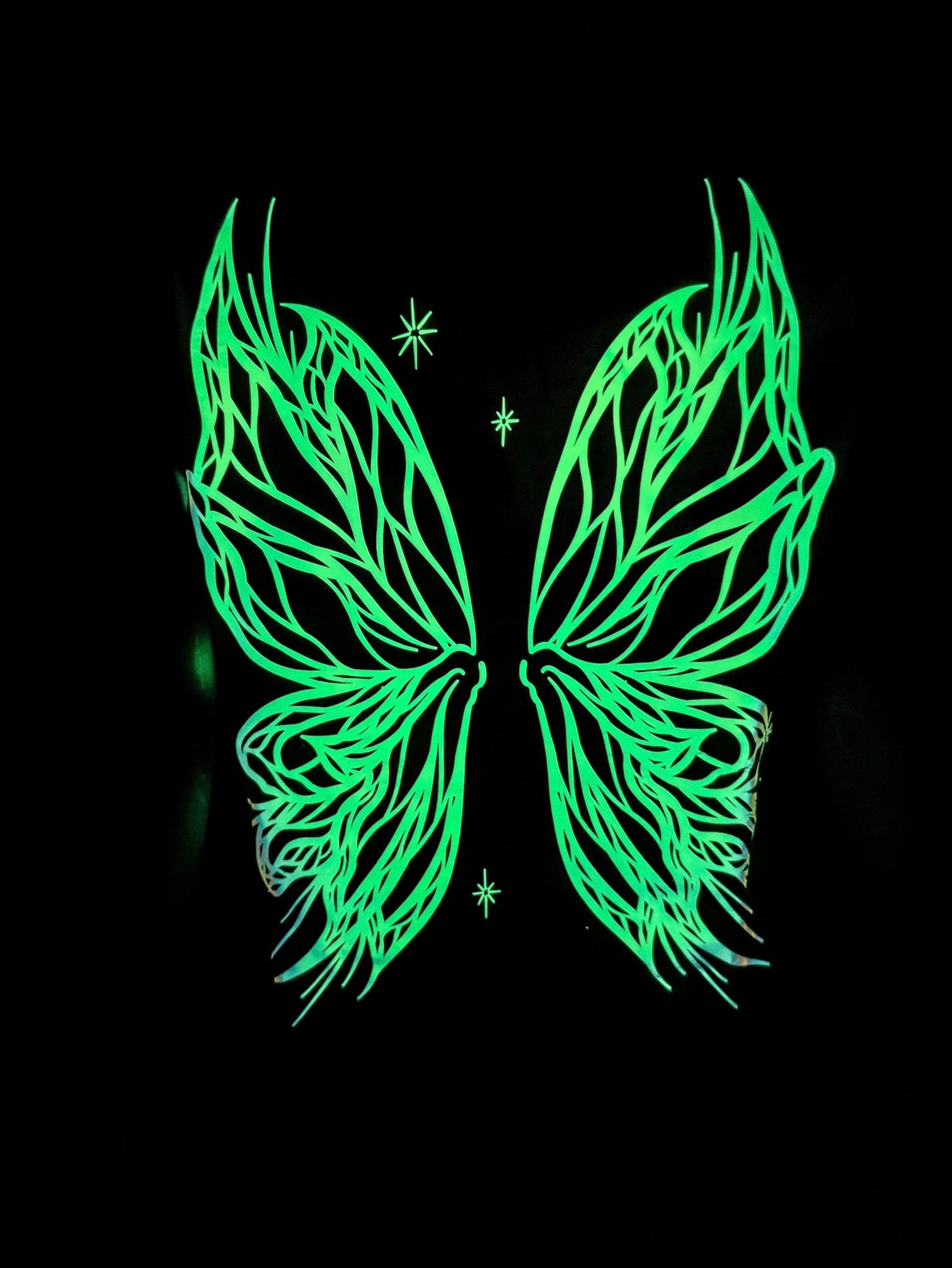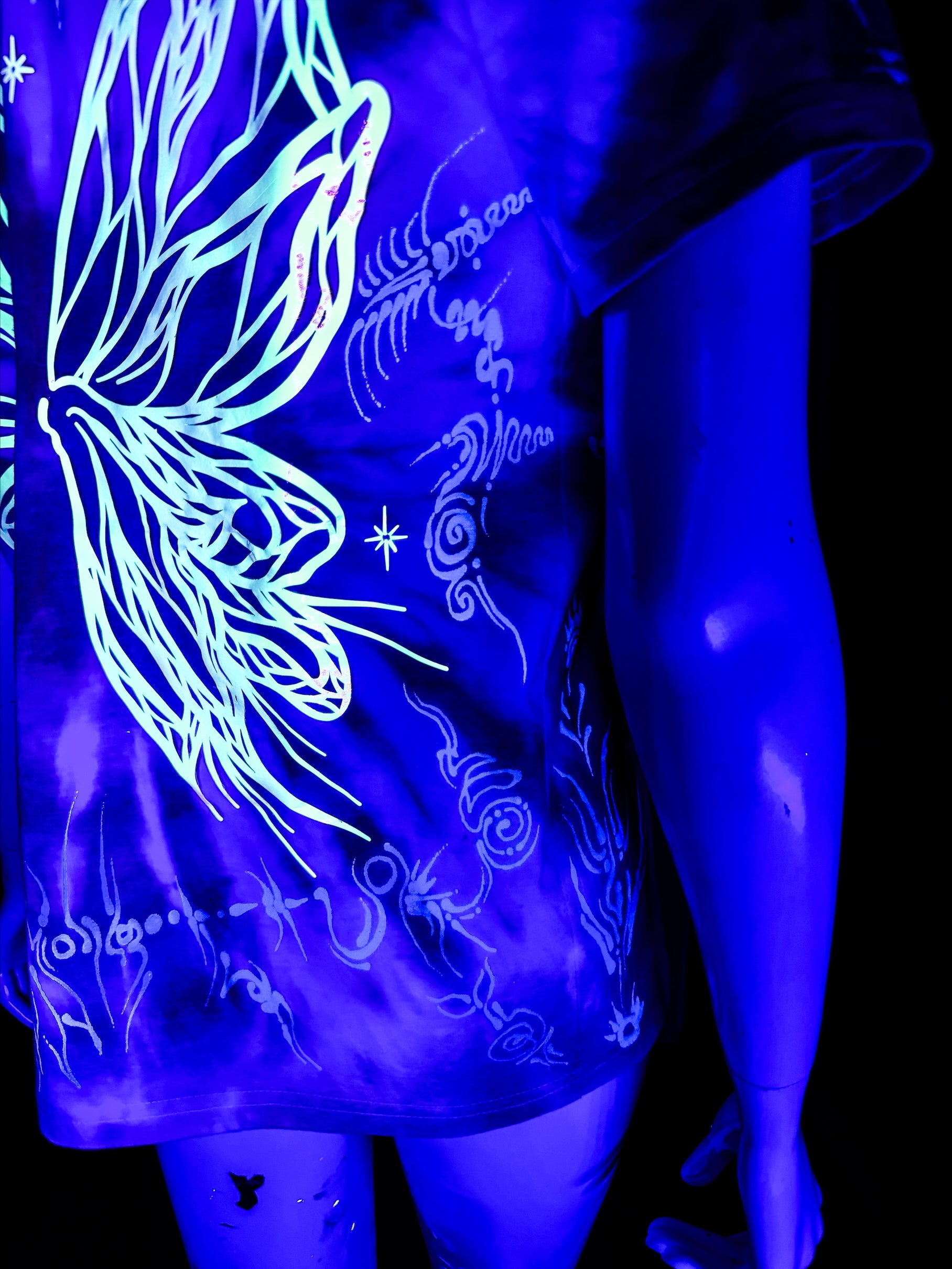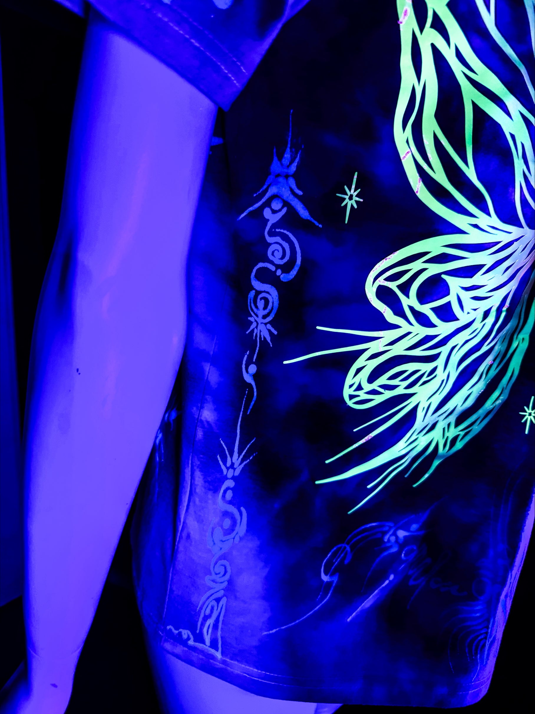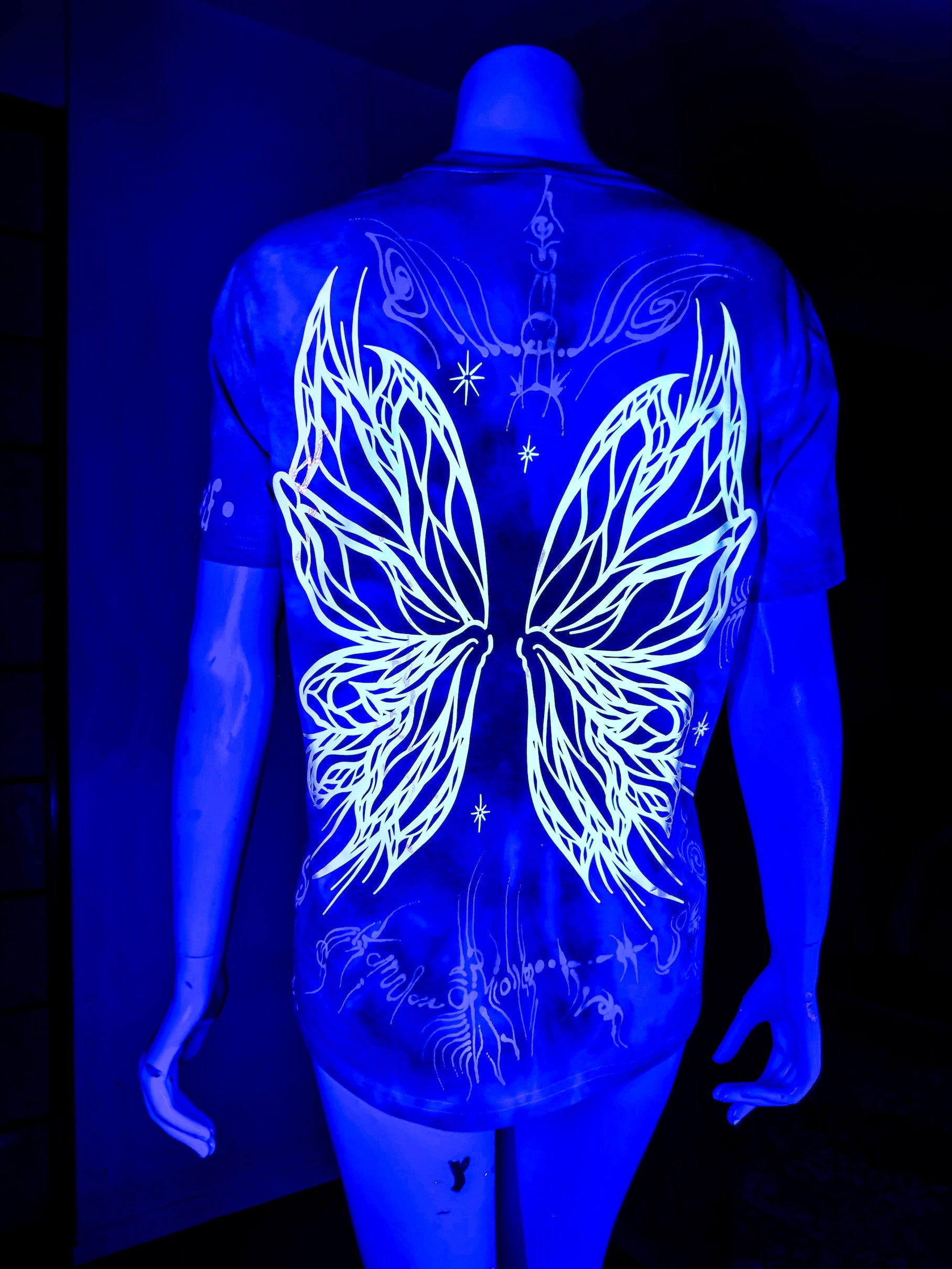 The painted designs on these shirts illuminate under black light, as do the glow wings on the back,