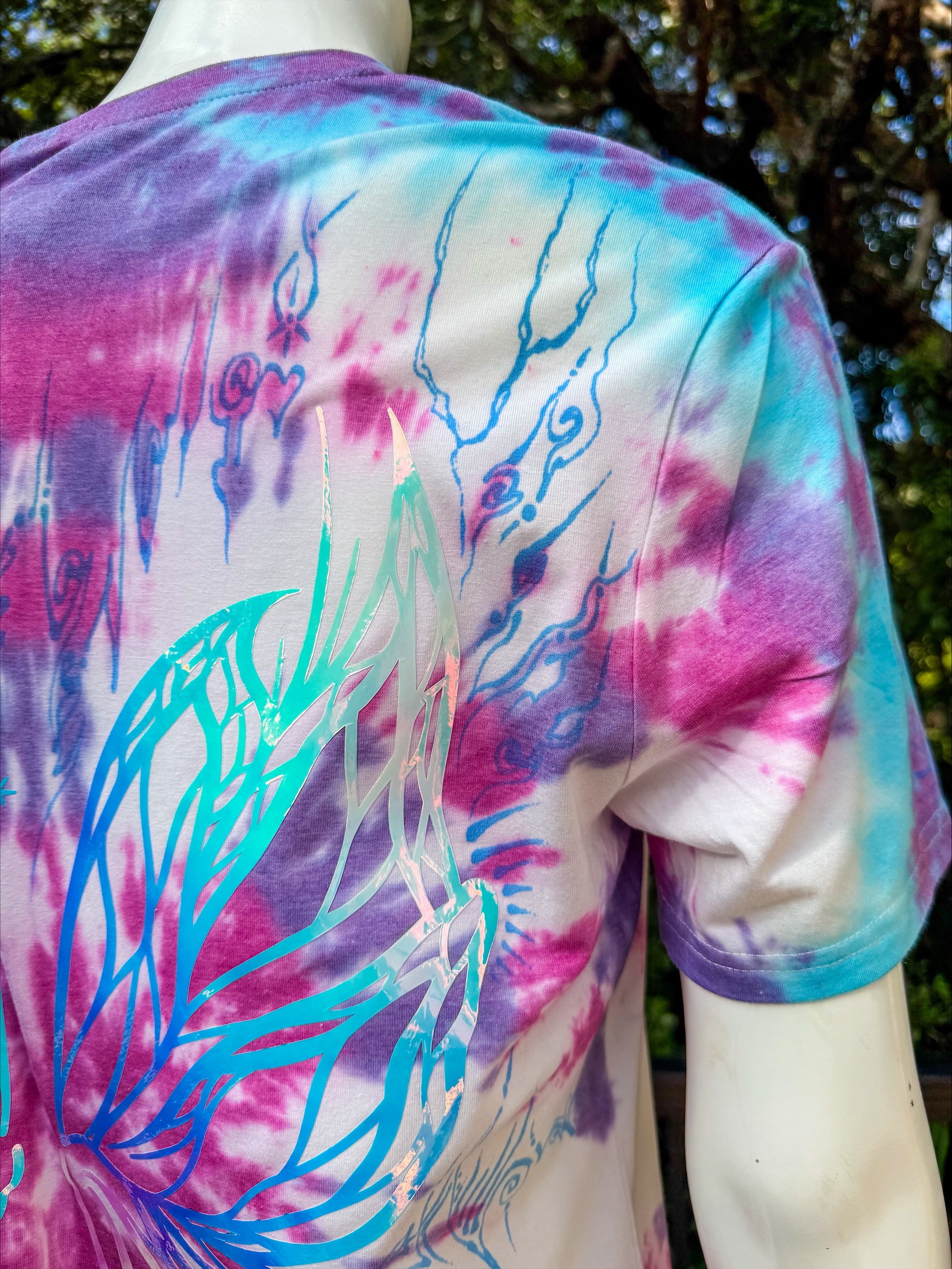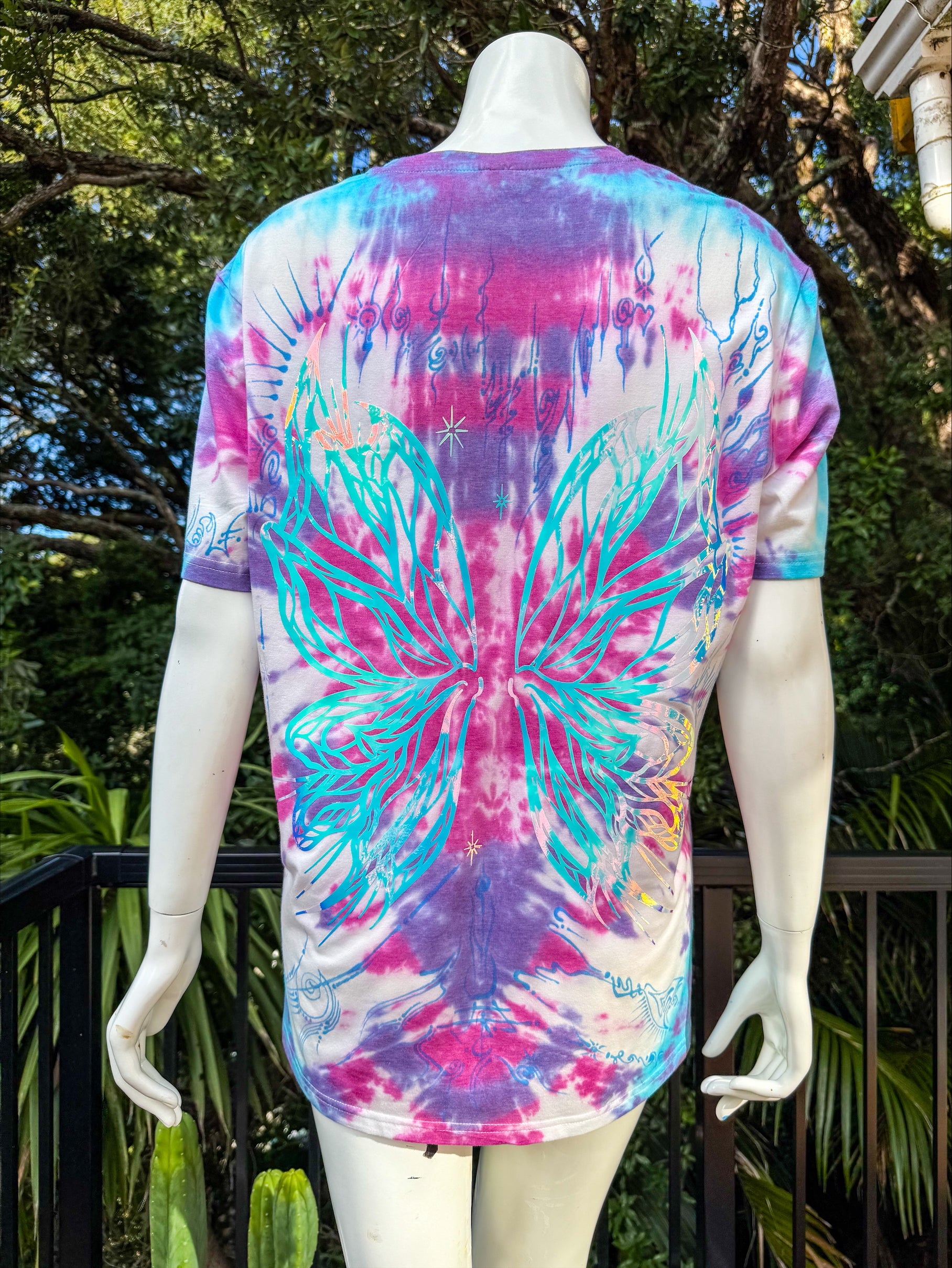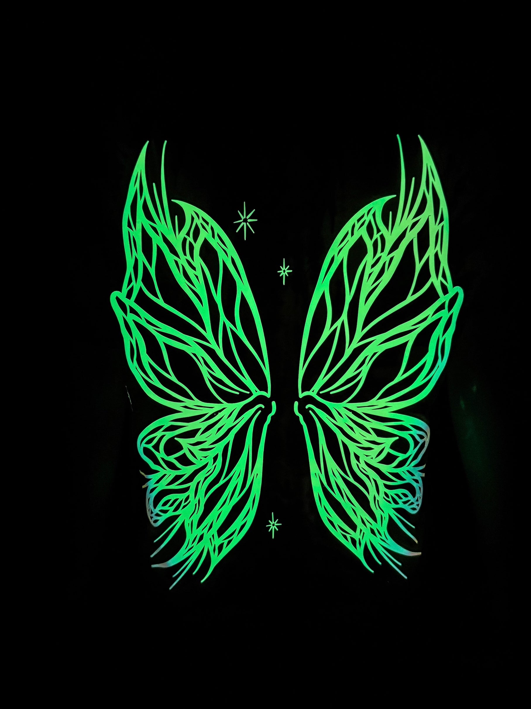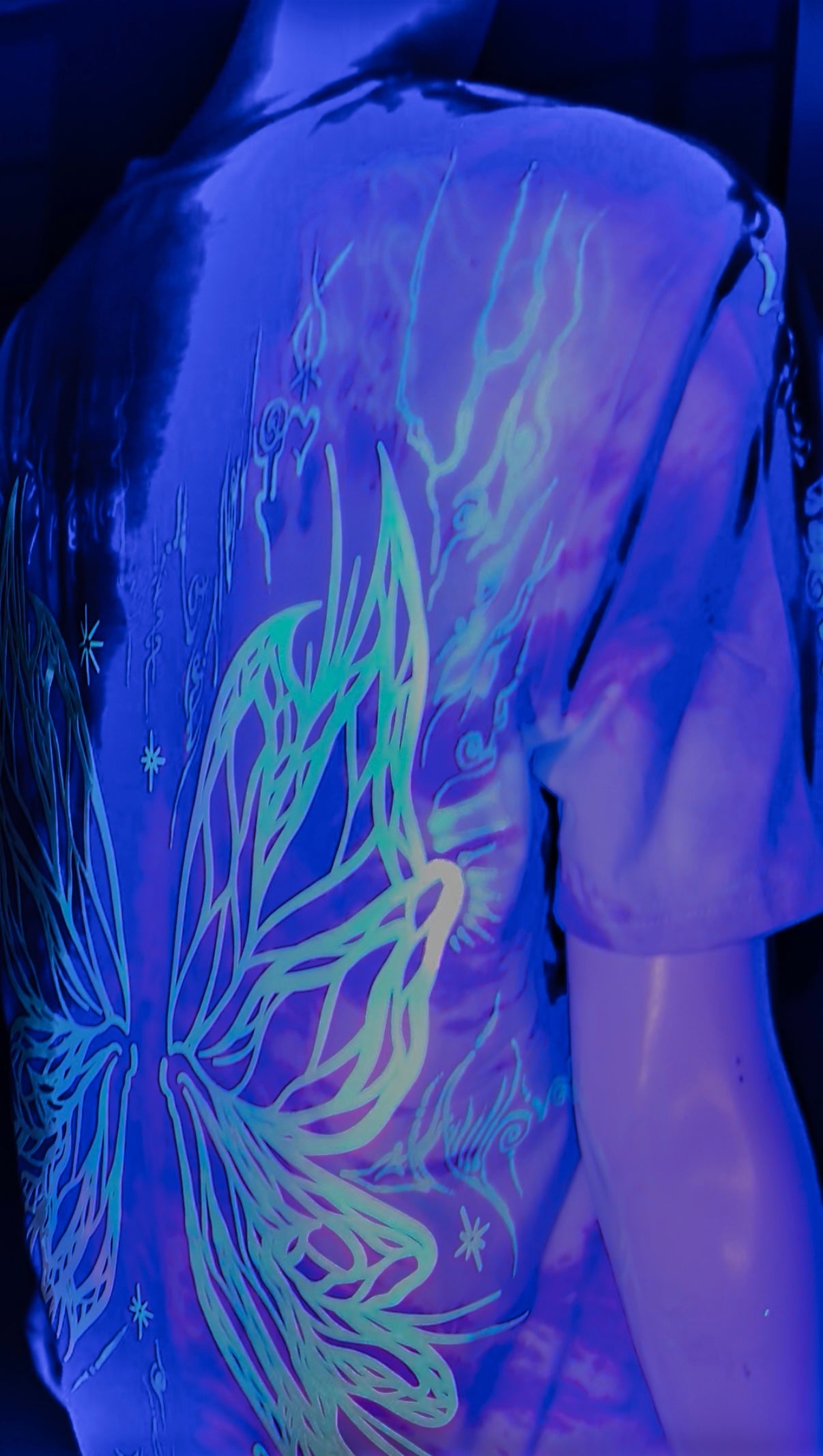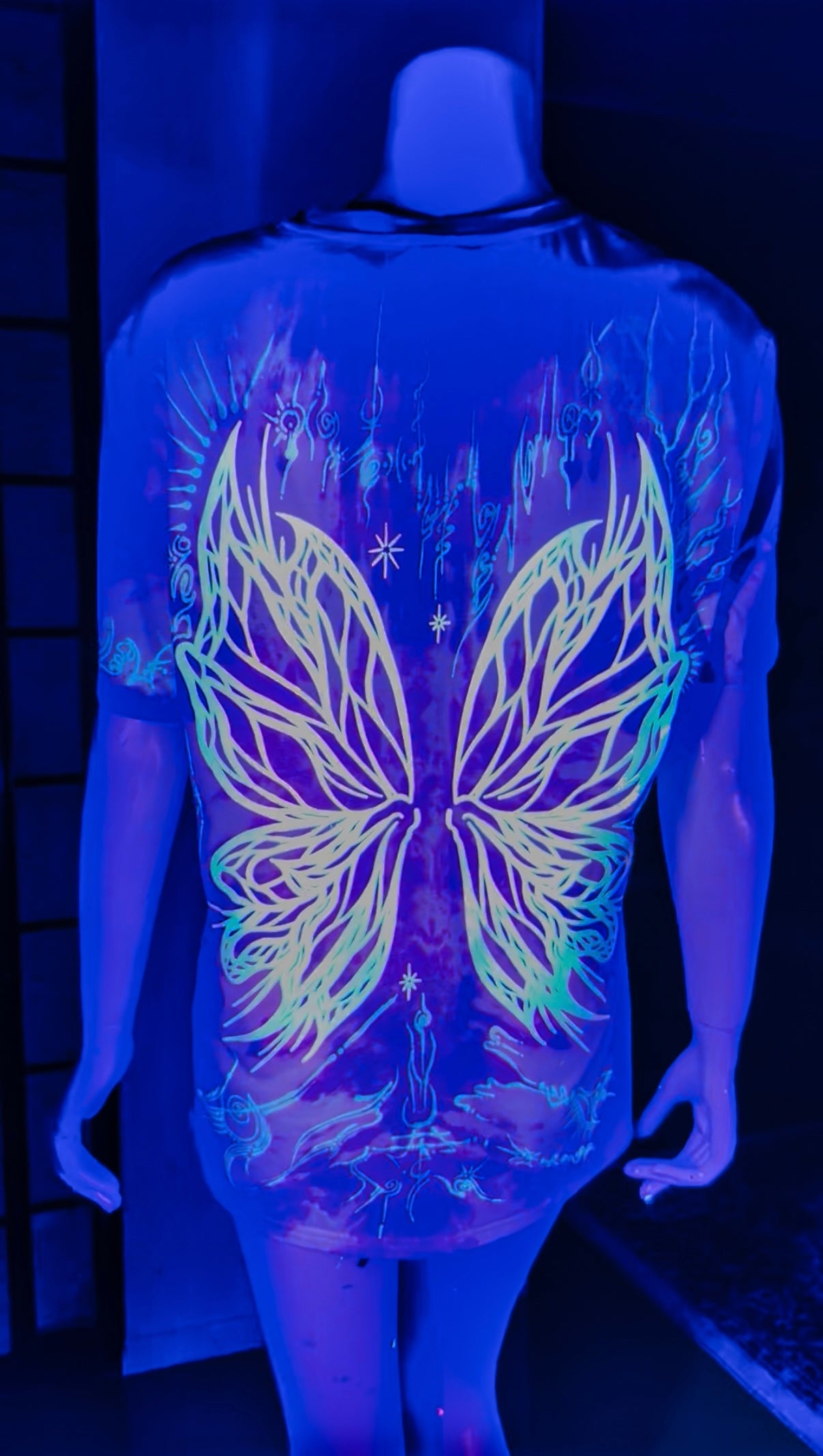 The painted designs on these shirts illuminate under black light, as do the glow wings on the back,