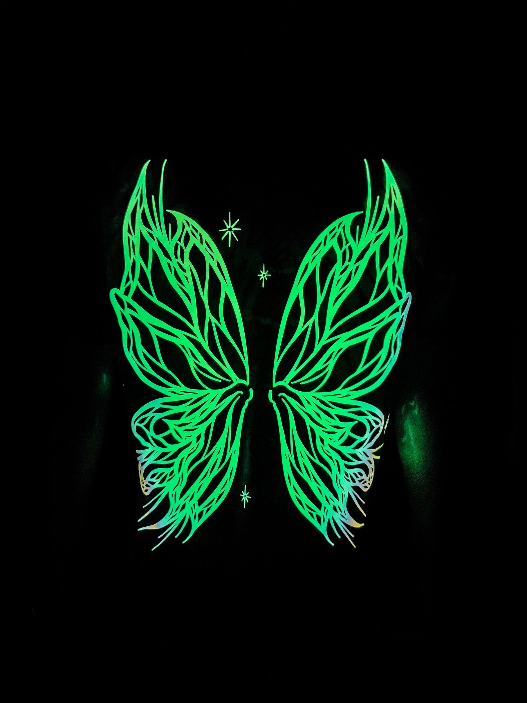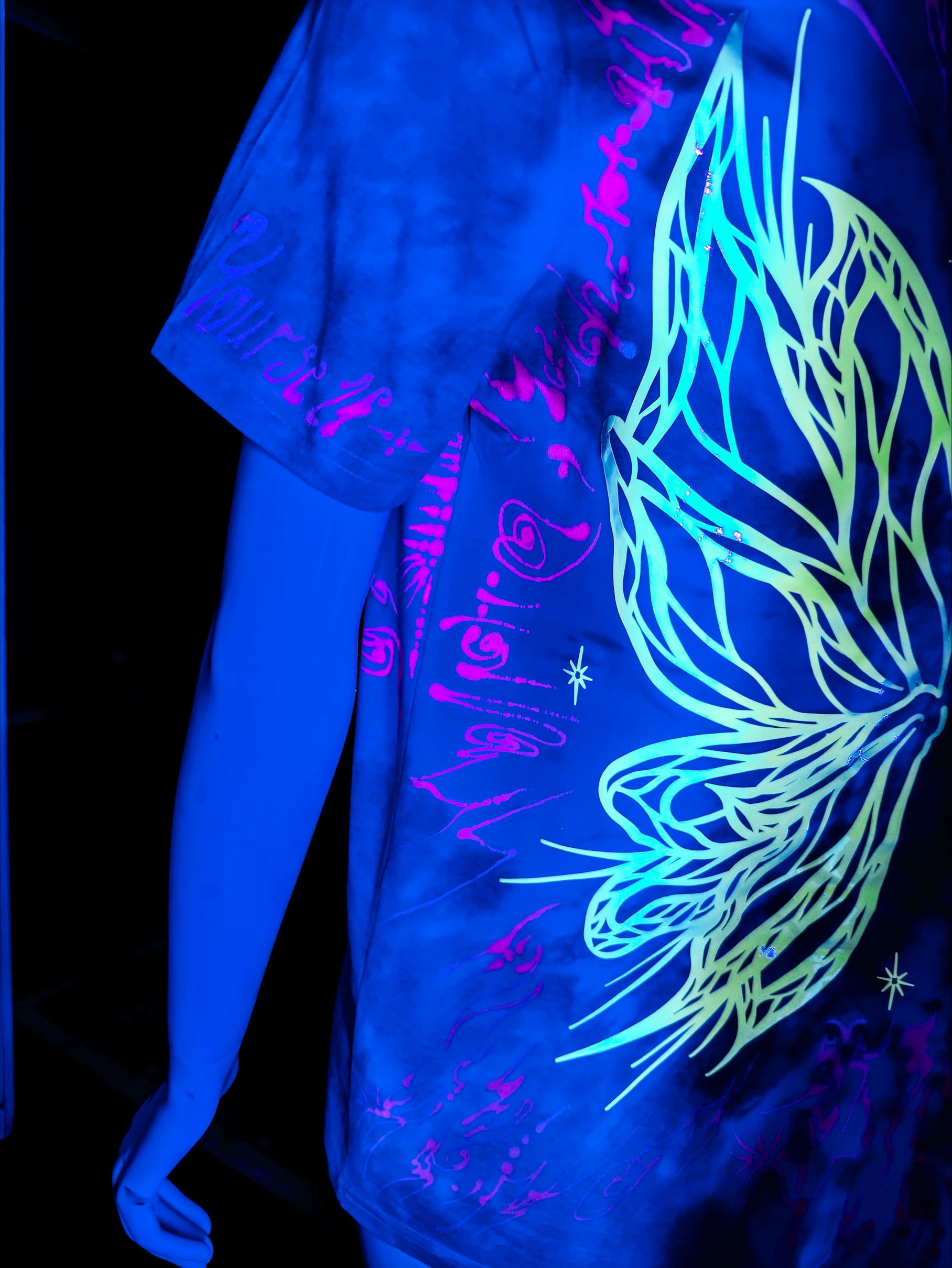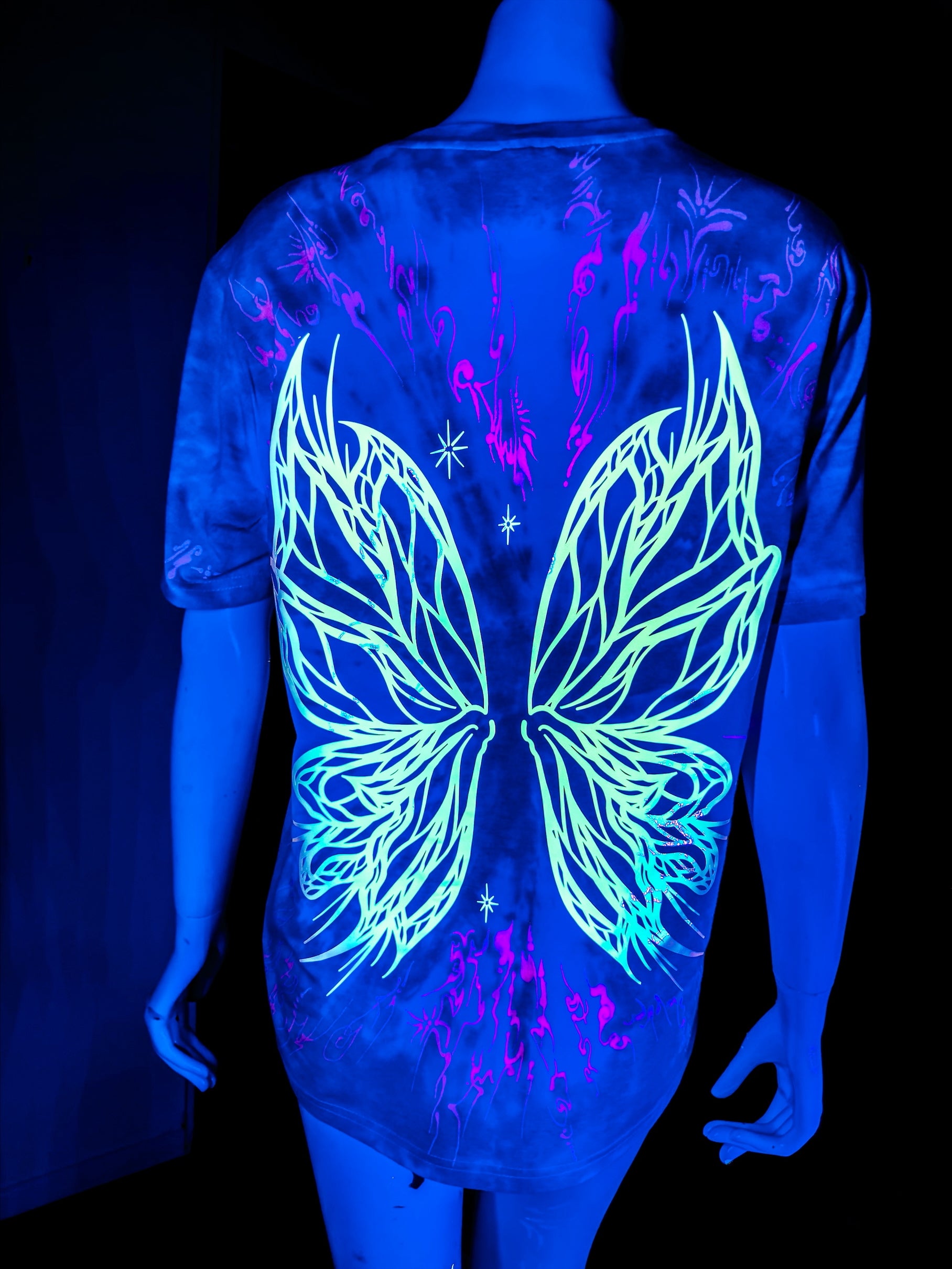 The painted designs on these shirts illuminate under black light, as do the glow wings on the back,