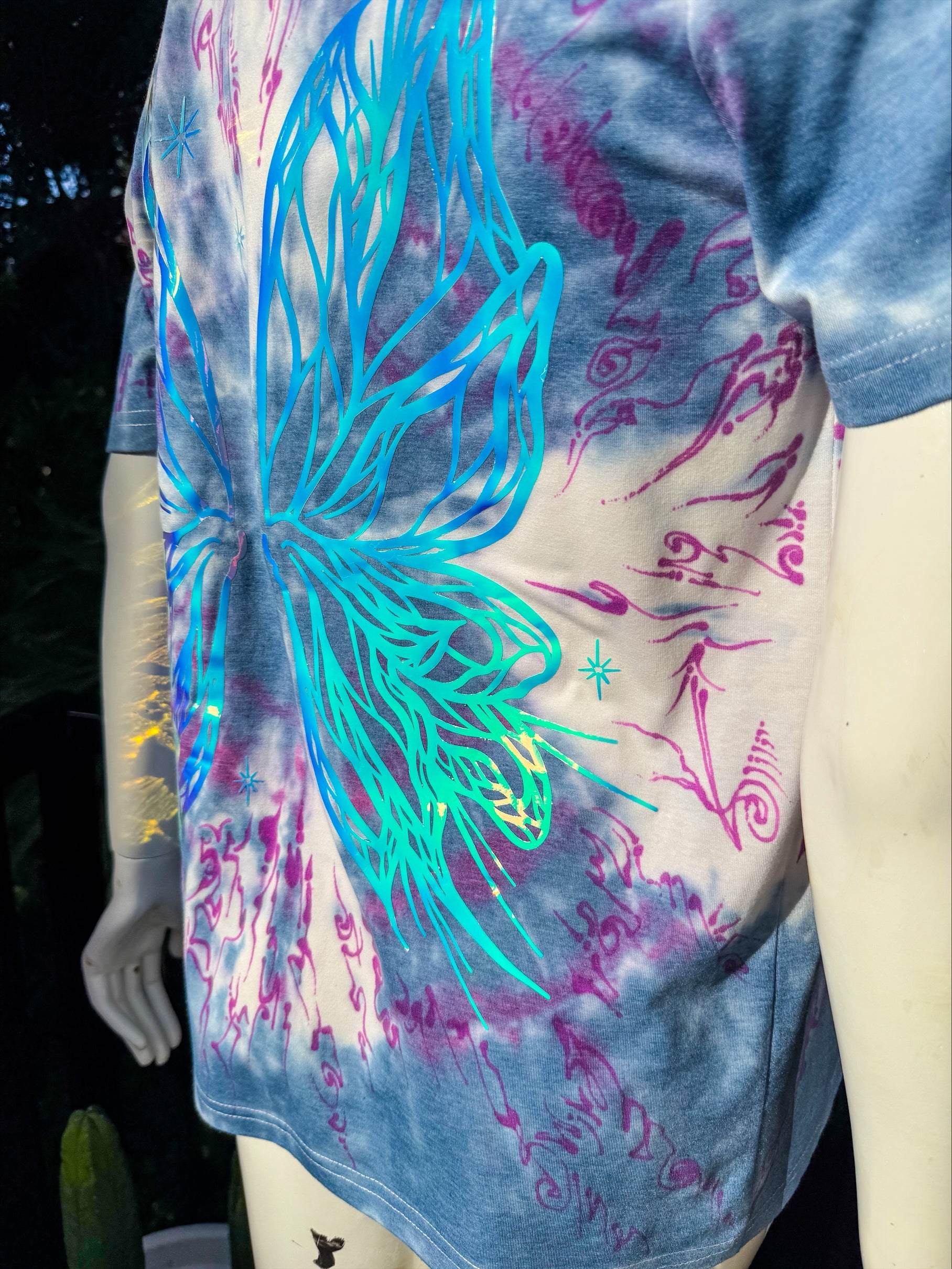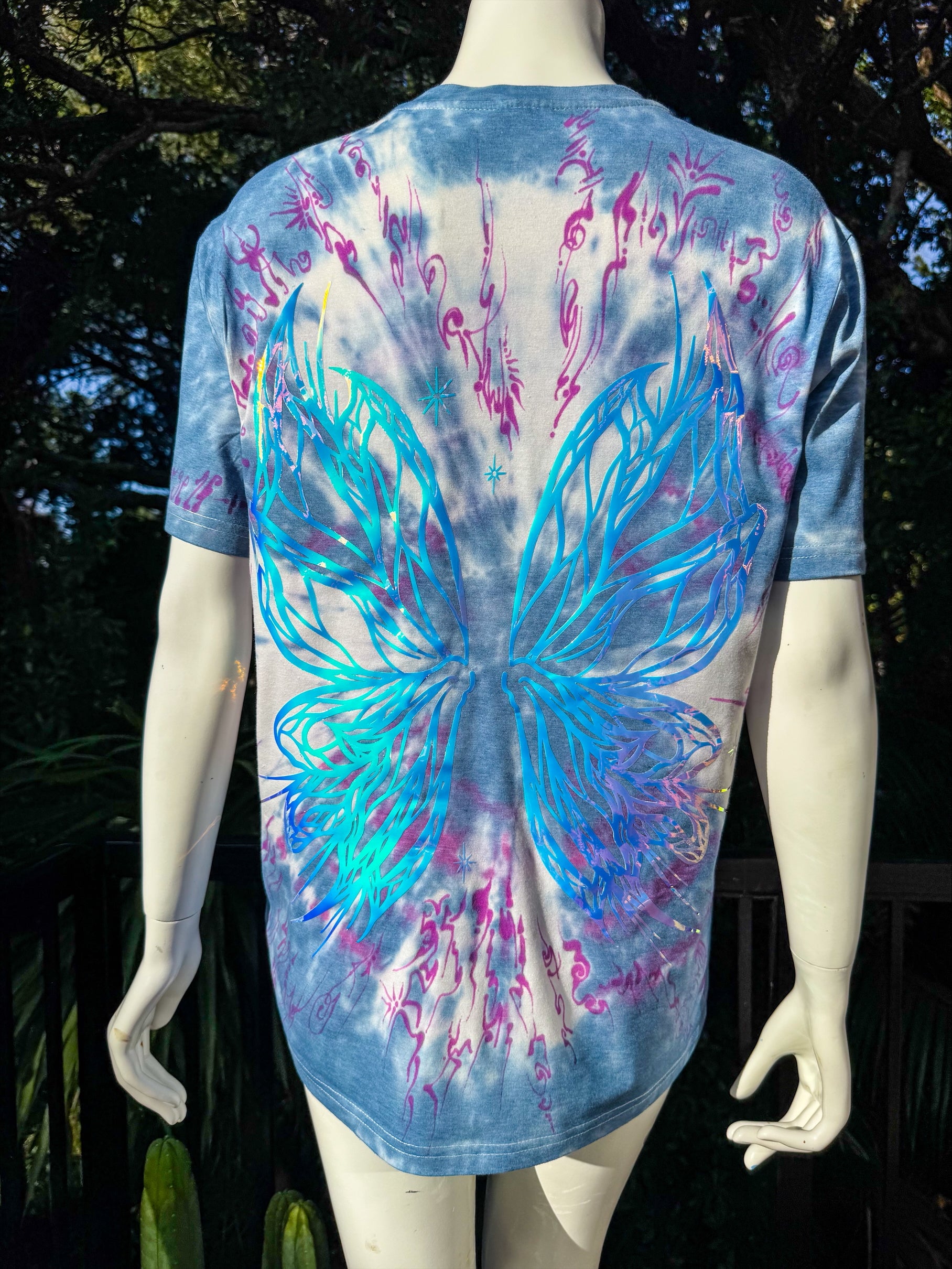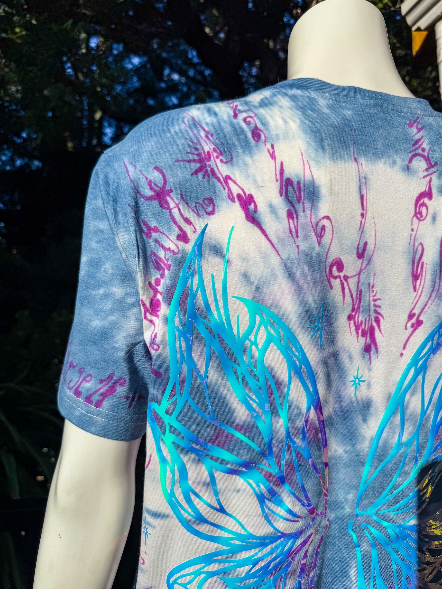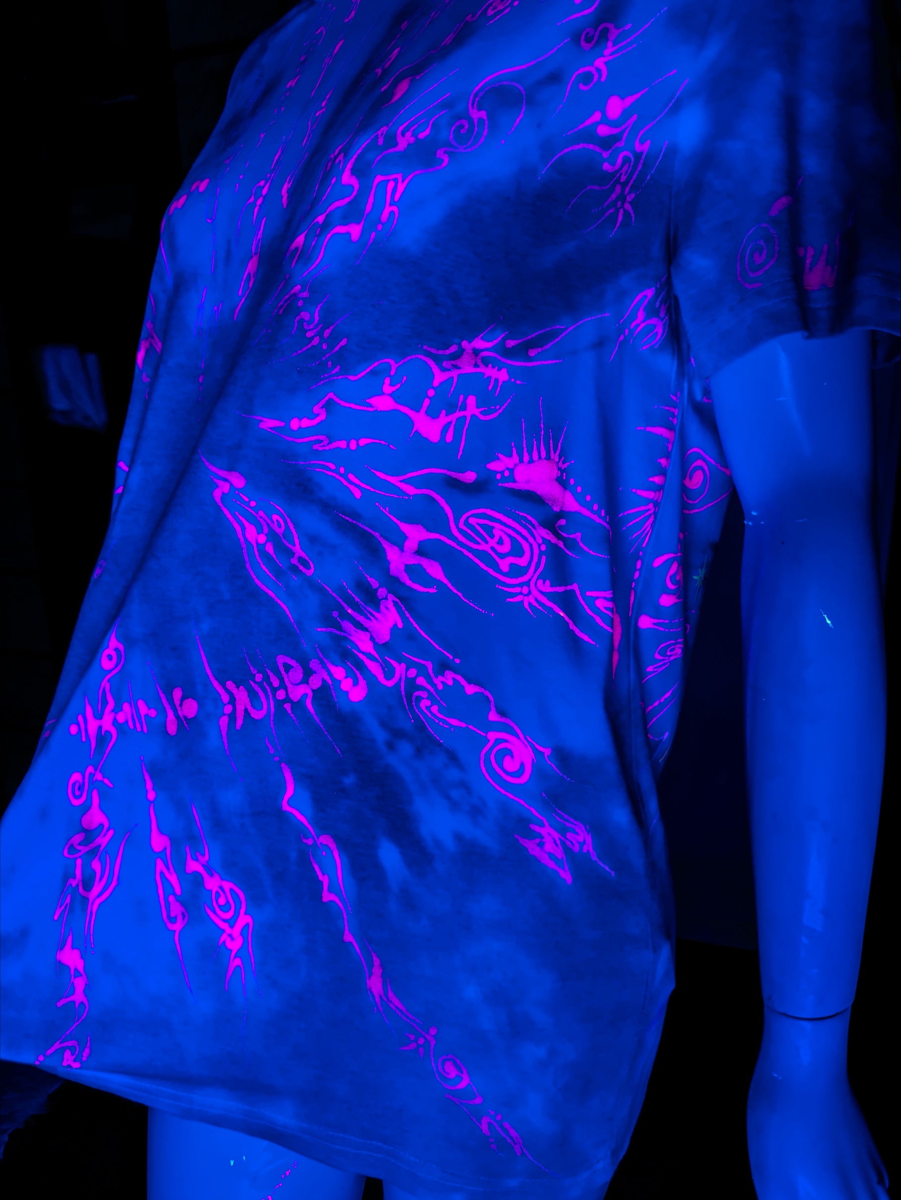 The painted designs on these shirts illuminate under black light, as do the glow wings on the back,